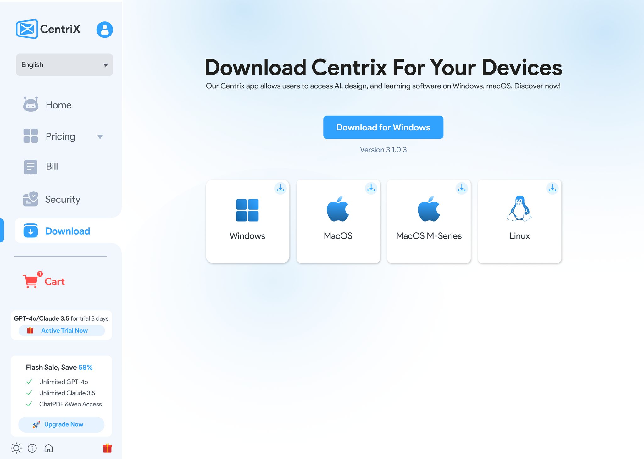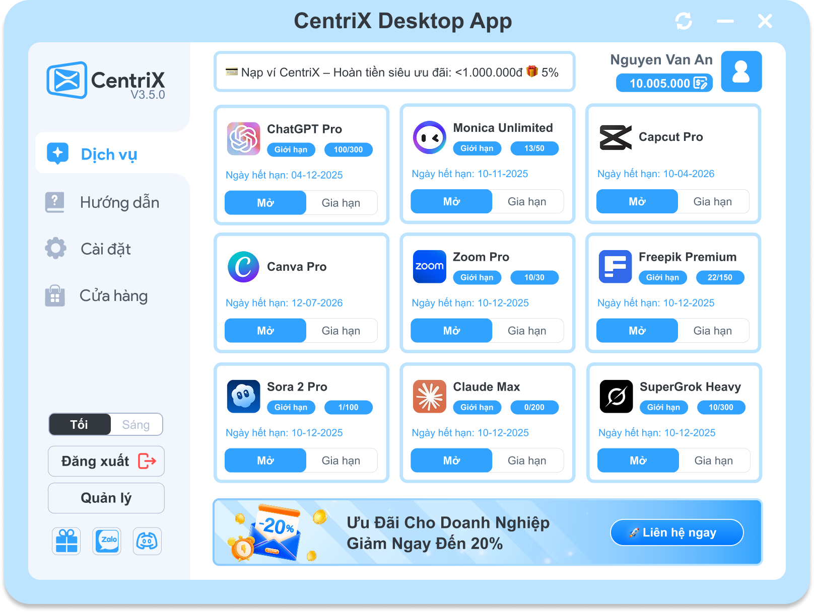Giúp doanh nghiệp của bạn dẫn đầu trong kỷ nguyên AI. CentriX App mang đến trọn bộ công cụ AI phổ biến nhất hiện nay, giúp từng phòng ban dễ dàng sử dụng, quản lý đồng bộ dữ liệu doanh nghiệp, tối ưu chi phí và tăng hiệu suất làm việc của nhân viên. Bắt đầu miễn phí ngay hôm nay!