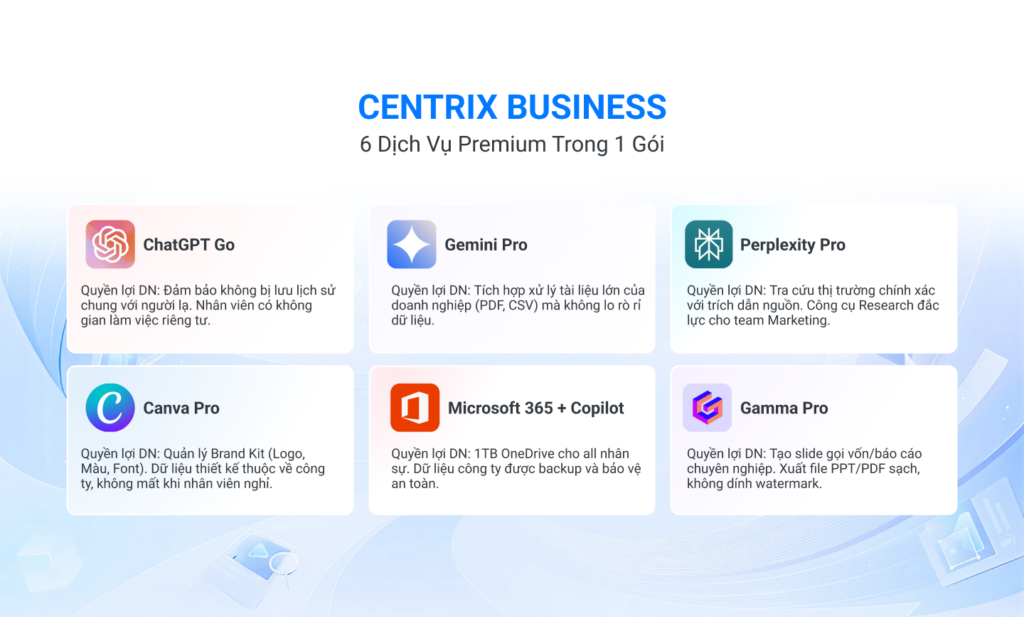 CentriX Business là gói All-in-One AI Dashboard cho doanh nghiệp, cho phép đội Sales sử dụng đồng thời nhiều công cụ AI cao cấp trong một hệ sinh thái thống nhất. Gói tiêu chuẩn hỗ trợ 5 người dùng (bao gồm 1 Admin), phù hợp với đa số team Sales vừa và nhỏ.