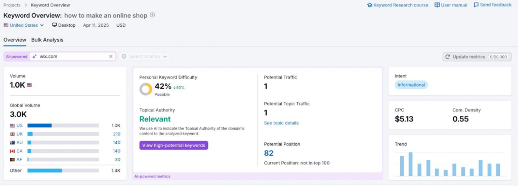 Đây là công cụ giúp bạn đánh giá nhanh một từ khóa thông qua các chỉ số như search volume, keyword difficulty, search intent, CPC và xu hướng tìm kiếm, từ đó giúp bạn quyết định có nên đầu tư vào keyword đó hay không trước khi đi sâu hơn.