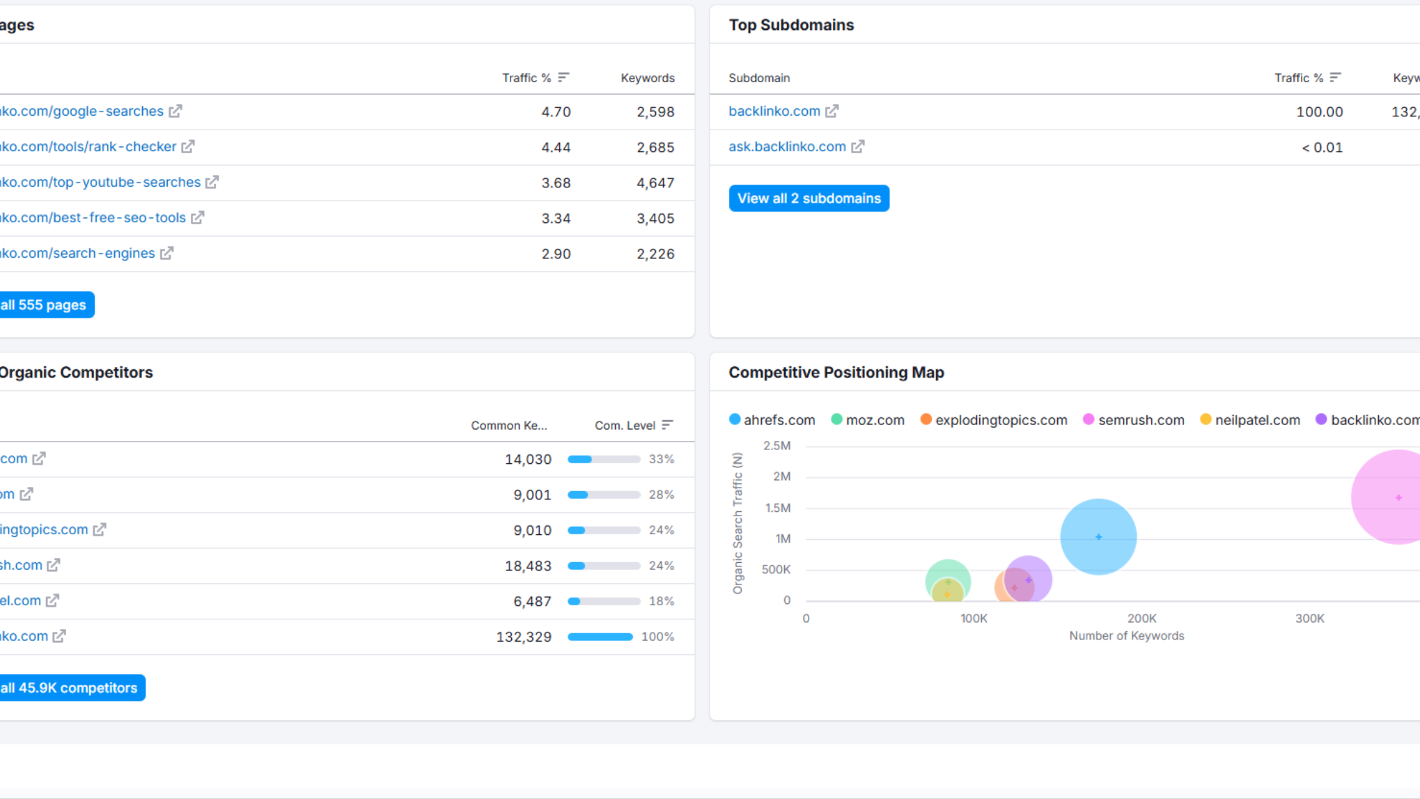 Đây là công cụ giúp bạn phân tích lượng traffic tự nhiên của đối thủ, bao gồm các từ khóa họ đang xếp hạng, vị trí trung bình và những trang đang thu hút nhiều lượt truy cập nhất, từ đó bạn có thể hiểu được chiến lược nội dung của họ đang tập trung vào đâu.