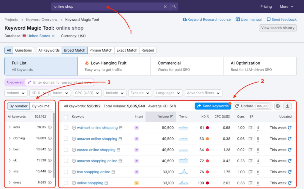 Một trong những lý do khiến Semrush trở thành lựa chọn hàng đầu của nhiều SEOer là khả năng nghiên cứu từ khóa cực kỳ mạnh, không chỉ dừng lại ở việc cung cấp danh sách keyword mà còn giúp bạn hiểu rõ bức tranh toàn cảnh của thị trường tìm kiếm.