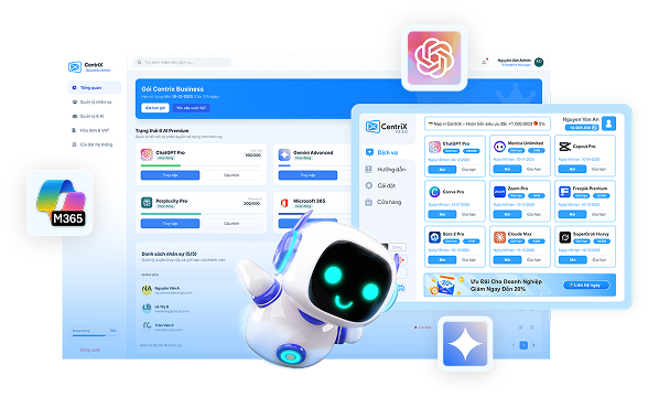 CentriX Business không chỉ cung cấp ChatGPT Go, mà còn là một hệ sinh thái AI cho doanh nghiệp với Gemini Pro, Perplexity Pro, Canva Pro, Microsoft 365 + Copilot và Gamma Pro. Việc triển khai tập trung giúp doanh nghiệp đồng bộ dữ liệu, phân quyền rõ ràng và đảm bảo bảo mật.